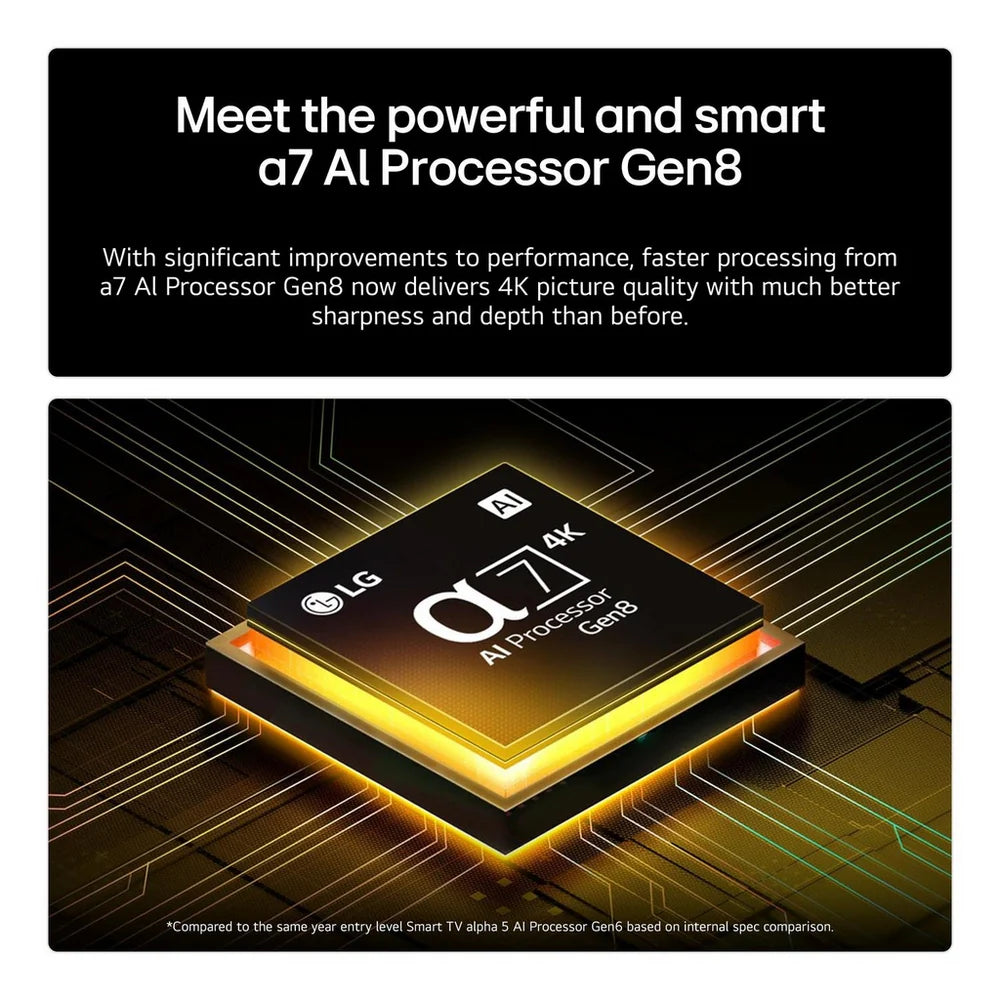 Explore endless entertainment with the intuitive webOS Smart Platform, giving you instant access to top streaming apps like Netflix, Disney+, and more. The LG Magic Remote lets you control your TV effortlessly using voice or pointer. Features like Voice ID and the AI Chatbot make personalising your TV experience easier than ever.